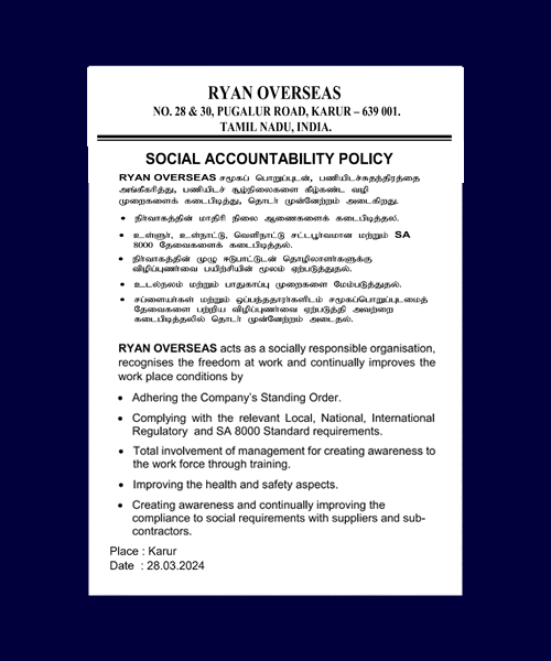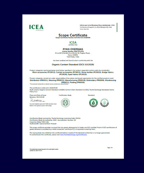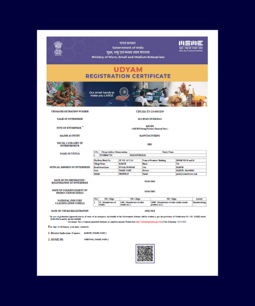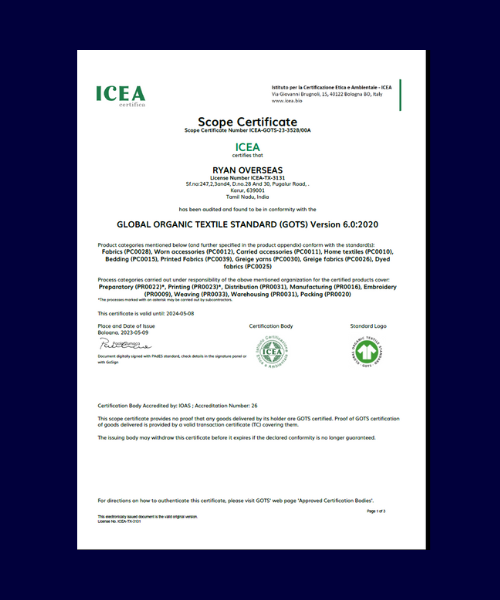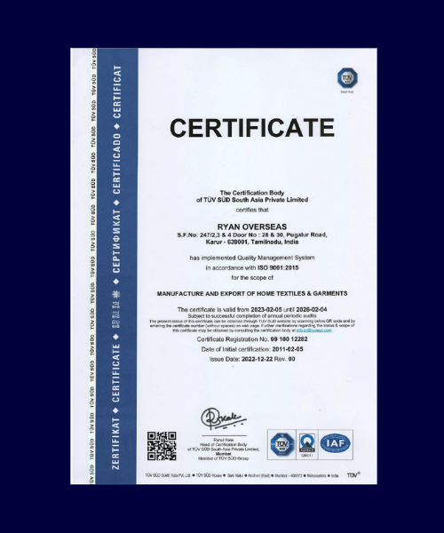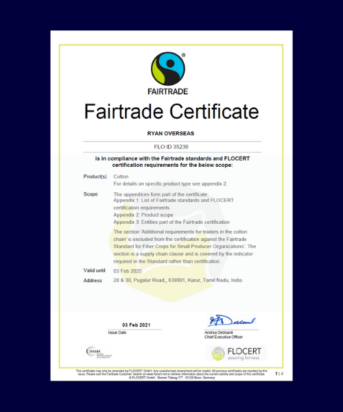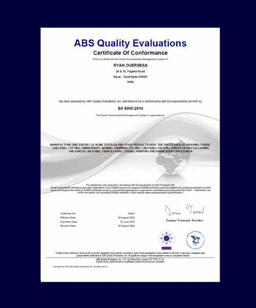Ryan Overseas has an impressive array of certifications, including ISO, SA 8000, Fair Trade, MSME, GOTS, OCS, and GRS, which attest to our commitment to quality, social responsibility, sustainability, and ethical practices.